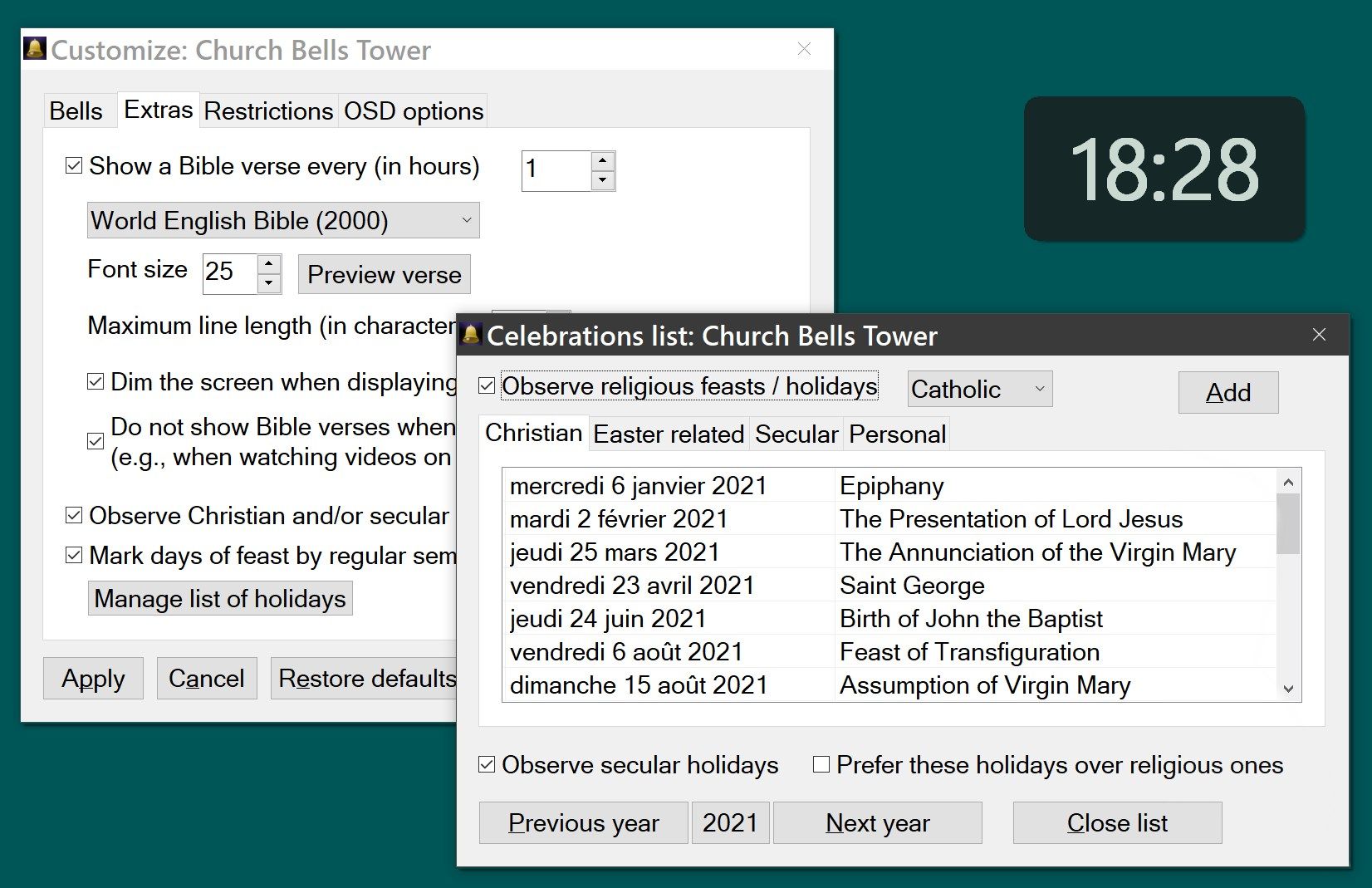 Church Bells Tower is an application that can toll quarters, on the hour, display astronomic details about the sun and moon, show random Bible verses, remind the user of Christian feasts and... reproduce semantron drumming sounds. Dedicated to bell lovers and Christians.
