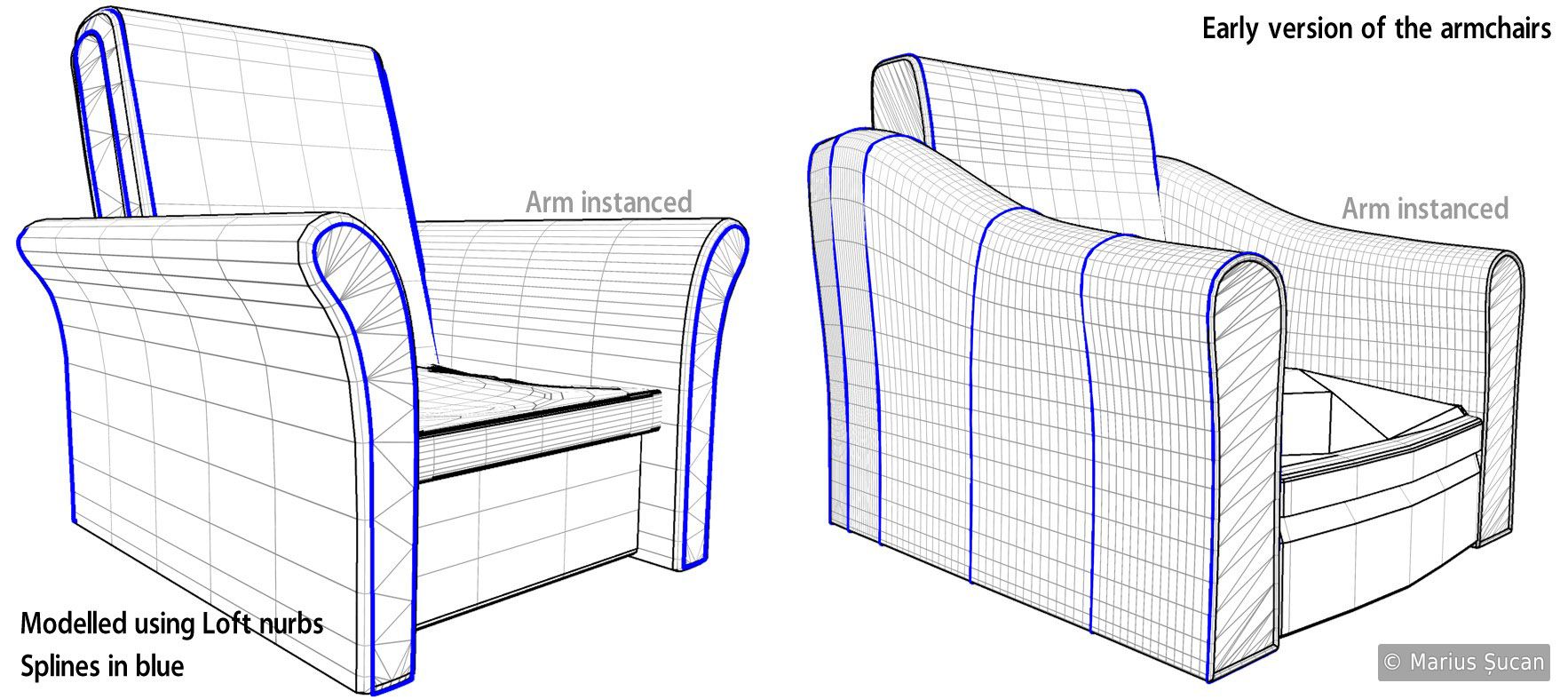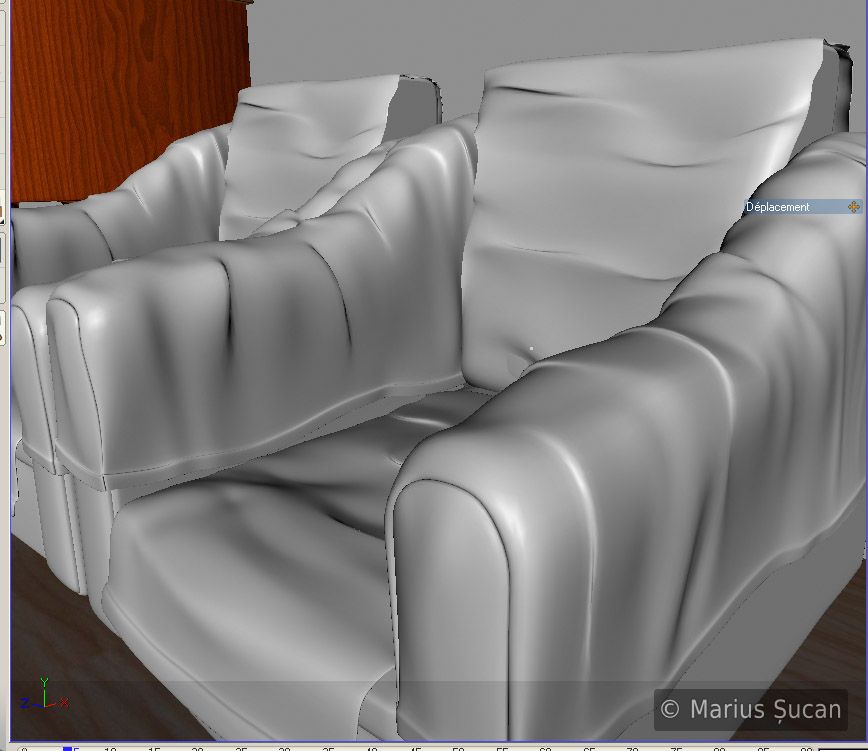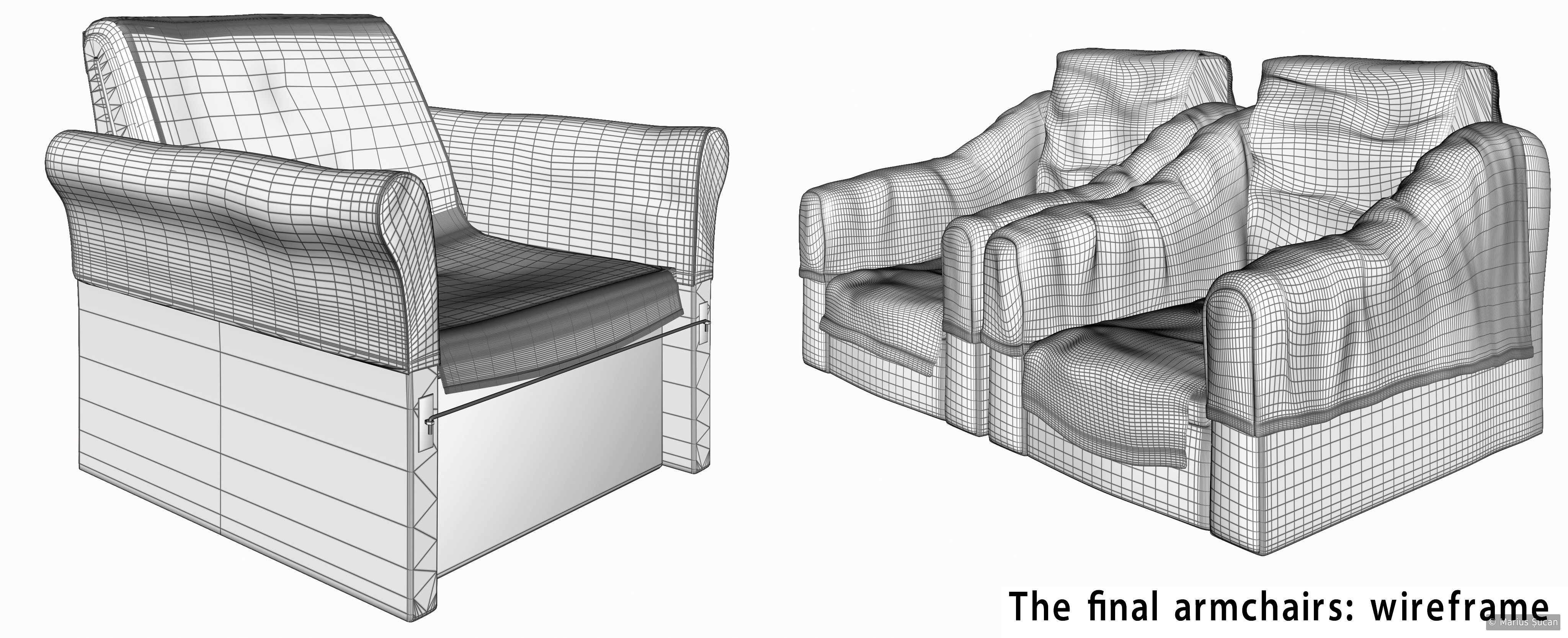 The seats of the armchairs were made from cubes with a moderate amount of polygons. After turning them into editable meshes I used various tools to get to the end result. The one piece brown cover was done using Loft nurbs again with a non-closed spline. This one as well, was turned into an editable mesh to make it look more natural using the brush tool: smearing, pinching and offsetting different regions.