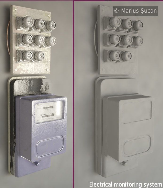 The electric monitoring system is modeled using primitives as well. The fuses were instanced after modeling two types. Basically, I used booleans and primitives to shape them, and also a bit of polygonal modeling.
