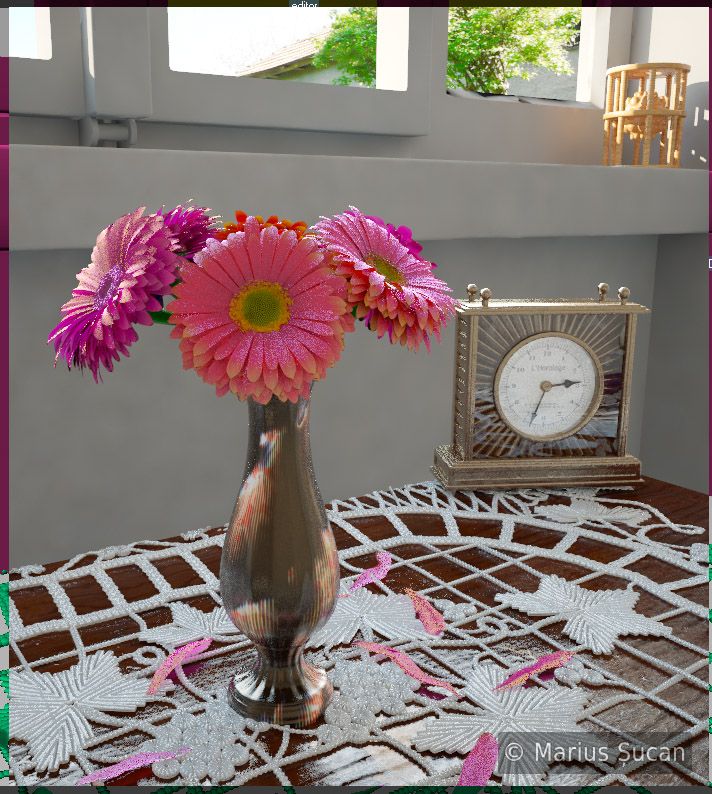 The dahlias were almost there, in terms of my expectations. I even textured them and I added variety into the small petals. The distribution of the petals was achieved with a Phyllotaxis object. The next image is rendered with AR.