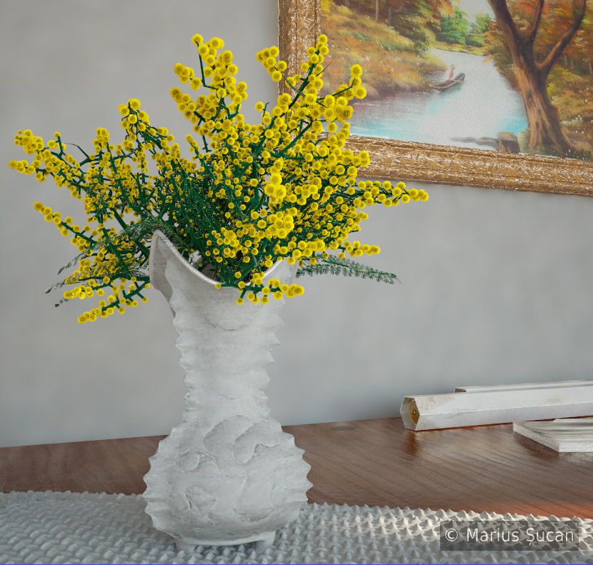 The mimosas, which replaced the dahlias in the end, were substantially more complex in terms of geometry. In general, they were more simple, but it was all about achieving the right branching and distribution. They are really very polygonal intensive as well. I turned them into an editable mesh to remove most of the intersections. The little yellow flowers are just spheres, of course, distributed with Xfrog.