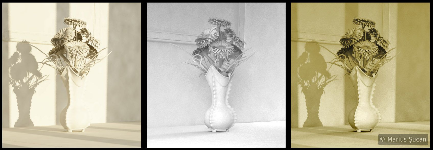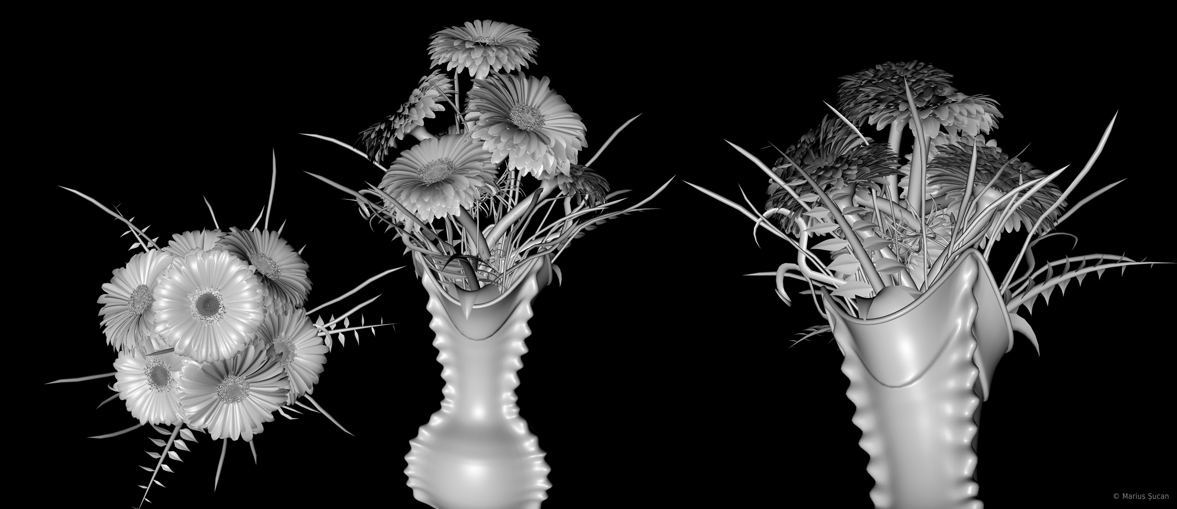 In the vases, I wanted to have bouquets. So, initially I modeled one, but it was too chaotic and too polygonally intensive. This bouquet consisted of semi-fantasy flowers, thus it wasn't really realistic, so I decided to focus on two types of flowers.