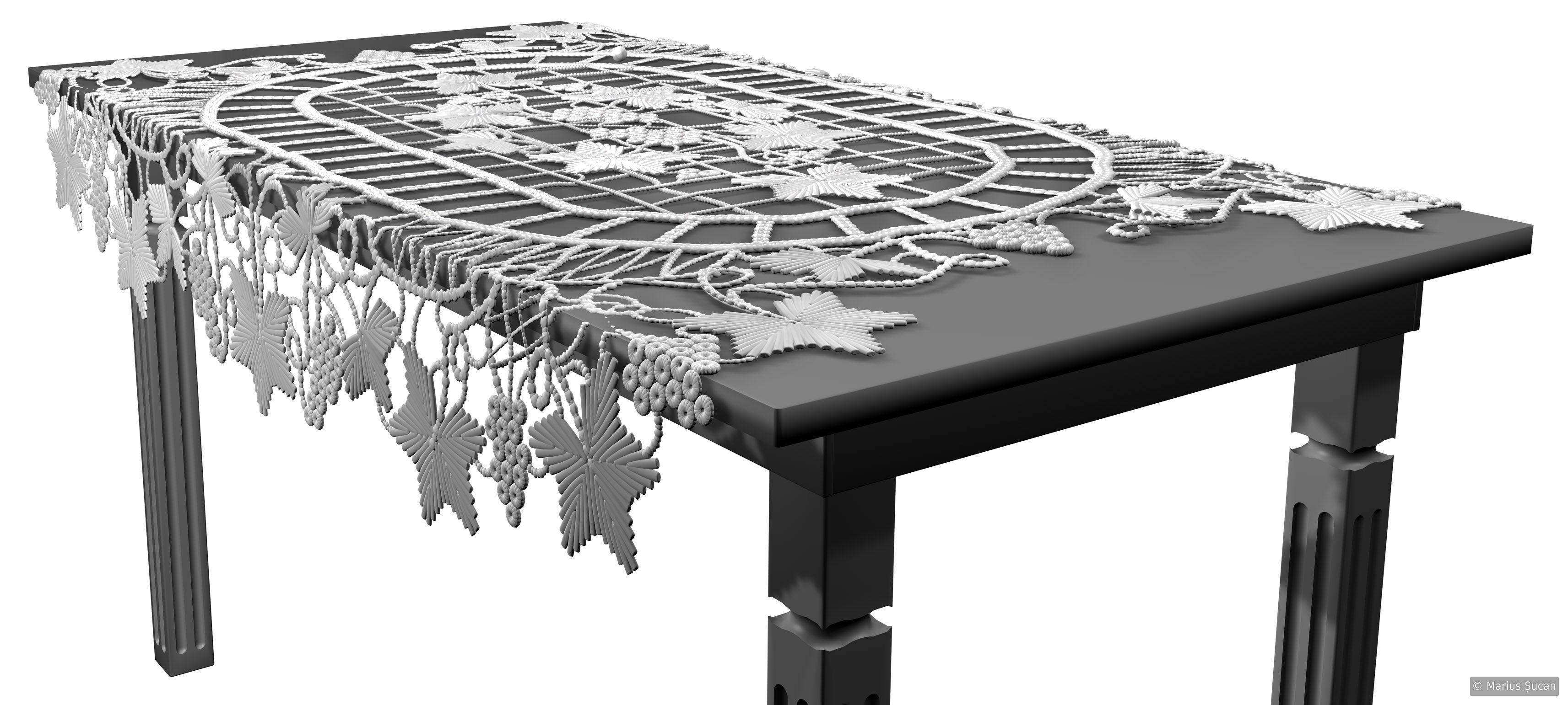 If I could name the most complex object in the scene, it's definitely the macramé, the white table cloth with leaves. It was a real hurdle to make it, but it was worth it.