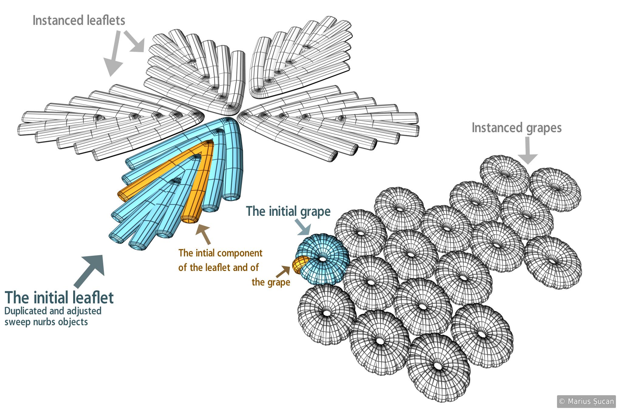 lot more simple. One little grape was done by having an array object cloning a tube, then this array was instanced
