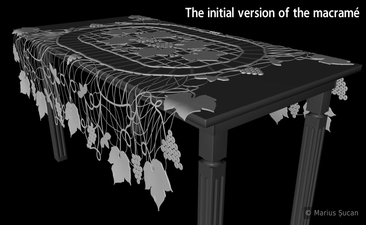 Because the modeling of this macramé took a lot of time, from November 2008 to late April 2009, I had other backup solutions. To be more precise, the first version of the macramé was rather simplistic. It wasn't detailed with Mograph cloned spheres and the grapes were simple torus objects, thus a grapes clusters was only about cloning the torus. Also, the leaves were a simple extruded spline. I was thinking, initially, that I could detail it with SPD, but I was wrong, because the UV maps were totally broken. Back then, I was working in 32 bits mode, so I was limited to only 3 Gb of memory. The utterly intensive "new" macramé, which I described above, was done after a long time, when I moved to a 100% 64 bits environment, thus my worries of not having sufficient memory were gone ;). In-between, I used a simple table cloth which had a texture resembling macramé's design (see image below). Of course, I wasn't satisfied of it, so I had to change it to the polygonally intensive and all shiny brand new macramé :).