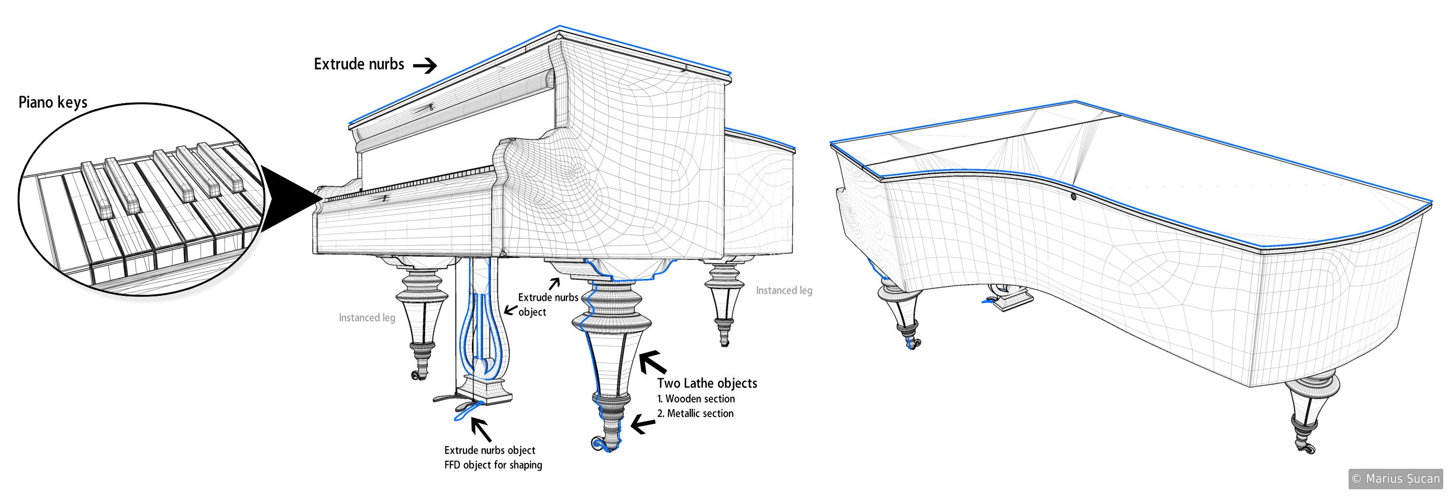 The design of the pedal rod, below the piano, was done with an extrude nurbs object applied onto a carefully designed spline based on the real life one.