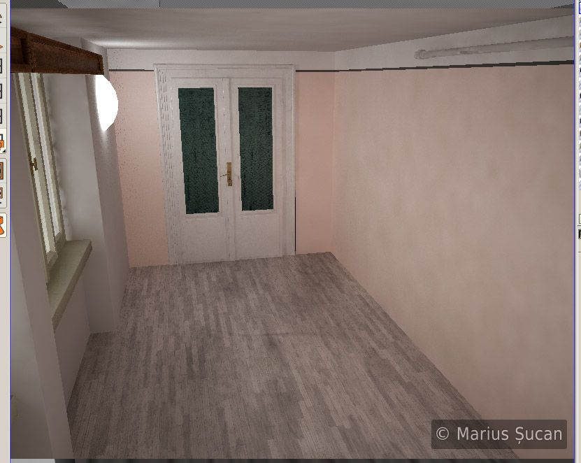 In general, the whole room was modeled using the primitive objects of C4D, mostly planes, cubes and cylinders. The walls are planes, cut out with booleans for the doors. The door frames are built with sets of cubes and cylinders. The following images show the rest of the room: