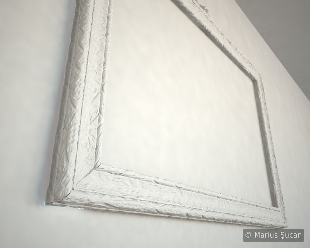 The frame of the wall painting is done with an extrude nurbs object and then instanced to get all four sides. I used SPD to detail the frame. Here you can see two renders with it: untextured and textured. The painting itself was extracted from multiple photos of the real painting.