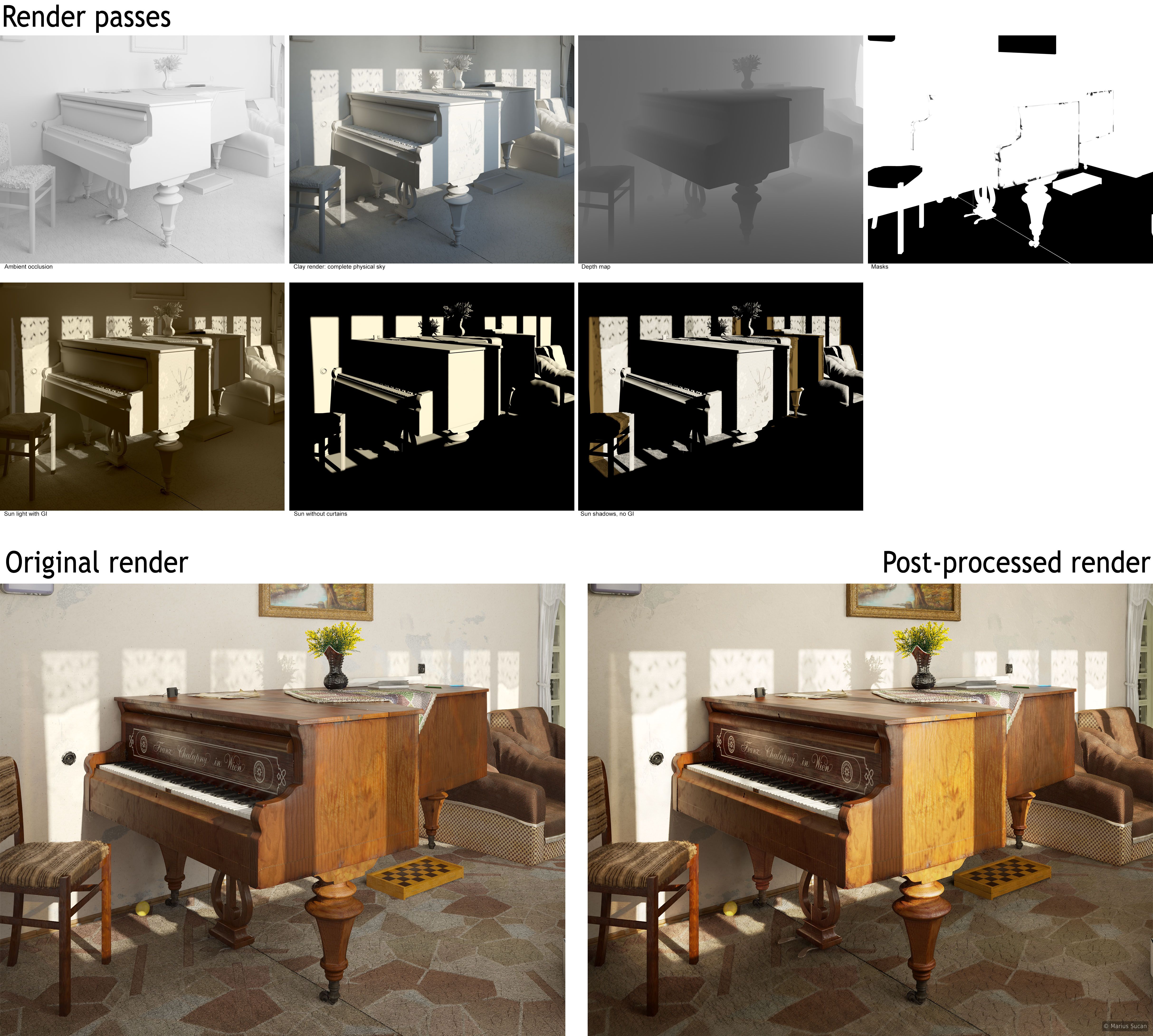 In the following images I list the post-processing passes I rendered. All these passes were used in Adobe Photoshop. I also show you the renders as they were before post-processing them. If you pay attention to the details, you may notice that many adjustments and fixes were applied for all three renders, besides the obvious work I've put into the lighting.