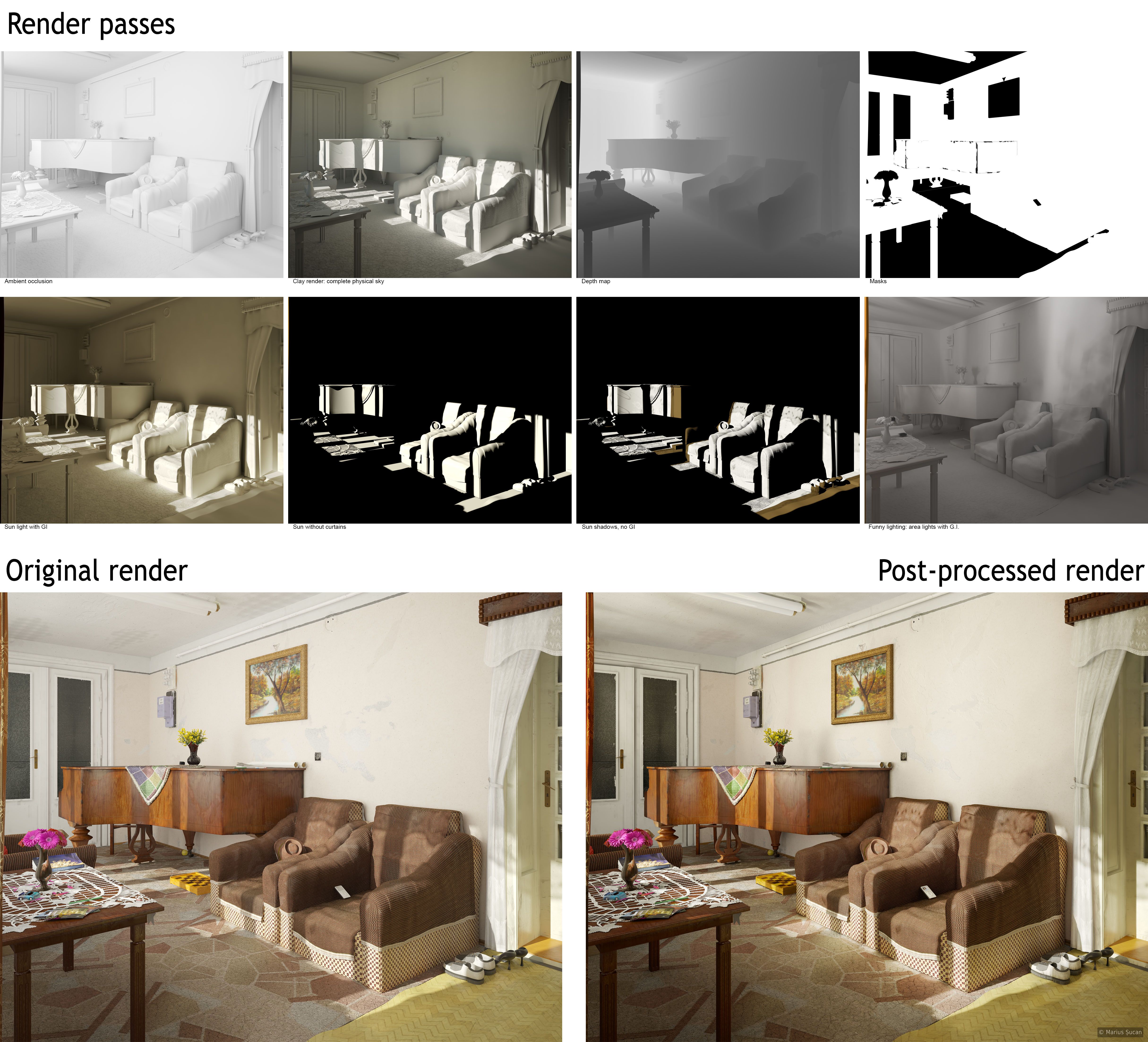 For post-processing, I rendered a multitude of layers for each perspective. The layers are all clay renders, but with different light setups which are meant to emphasize different aspects of the lighting in the given perspective. I rendered two types of ambient occlusion (AO) passes: the classical AO shader from C4D, a pass which in the end I didn't use, and a Vray type of AO. The Vray AO was obtained by having the environment set to white and the material of the objects almost white, a tip I learned from the VrayforC4D forums. I also rendered a depth map pass, black and white masks of objects and a clay render with the complete lighting with physical sun and sky, with GI on, for all the three perspectives. To control the impact of the sunlight, without the sky, I rendered a special pass just for the sun with GI on. The resulting image gave me the possibility to control the amount of light bounced by the sun beams on the floor and objects. And, of course, I rendered another pass with no GI and with the curtains to cast shadows, so that I can also control the sunlight beams intensity on the objects.