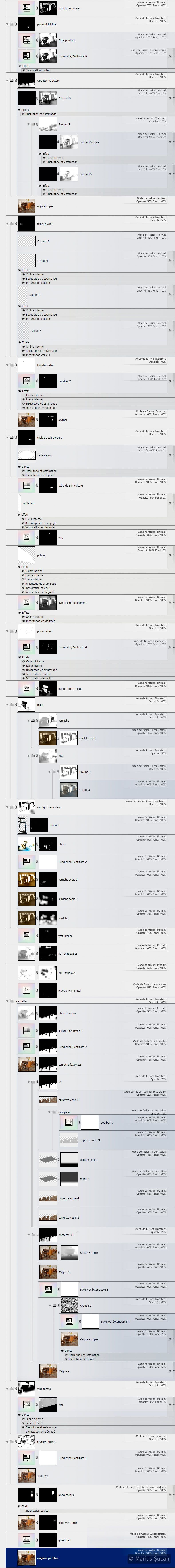 For those more curious, I prepared the following image which shows the multitude of layers used to post-process the renders, applied on a gray background. This allows one to observe the intense work done in regards to the lighting and the shadings of the objects.