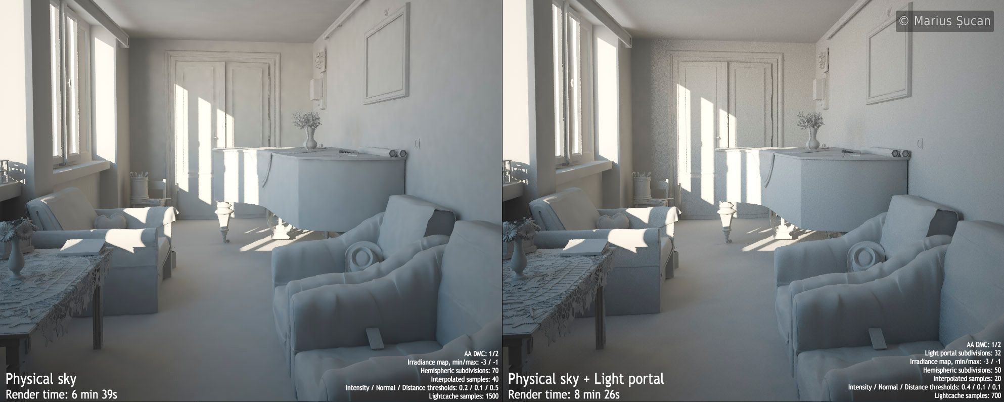 I tried to optimize the render time by using a light portal for the big windows found in the room. But, this is not a solution, the rendering time is a bit slower and the image gets noisy. I could clear the noise, but at a great expense in terms of render time. I thought I'd complicate things even more with it, so I dropped this idea. Here's a test render comparison and the render times: