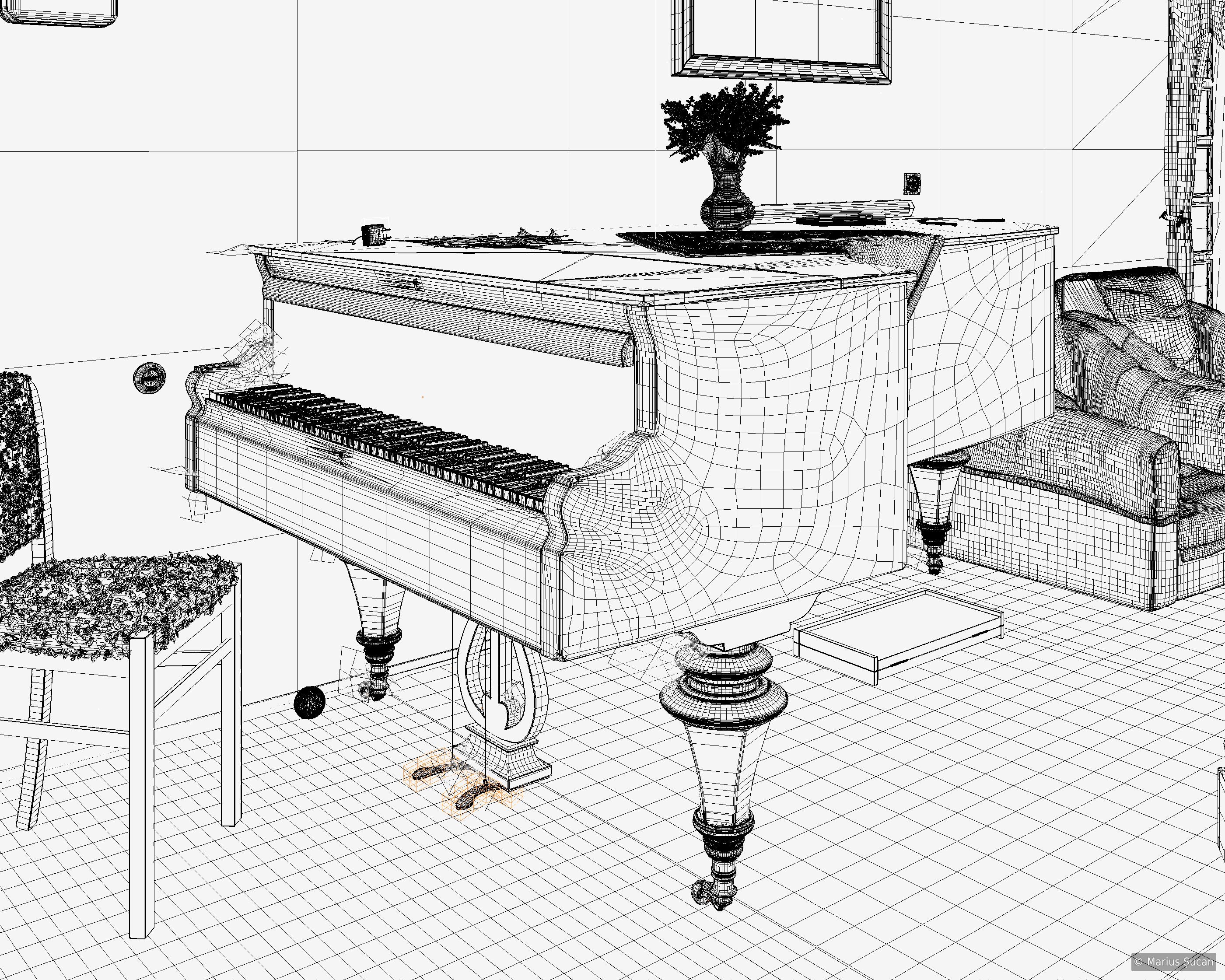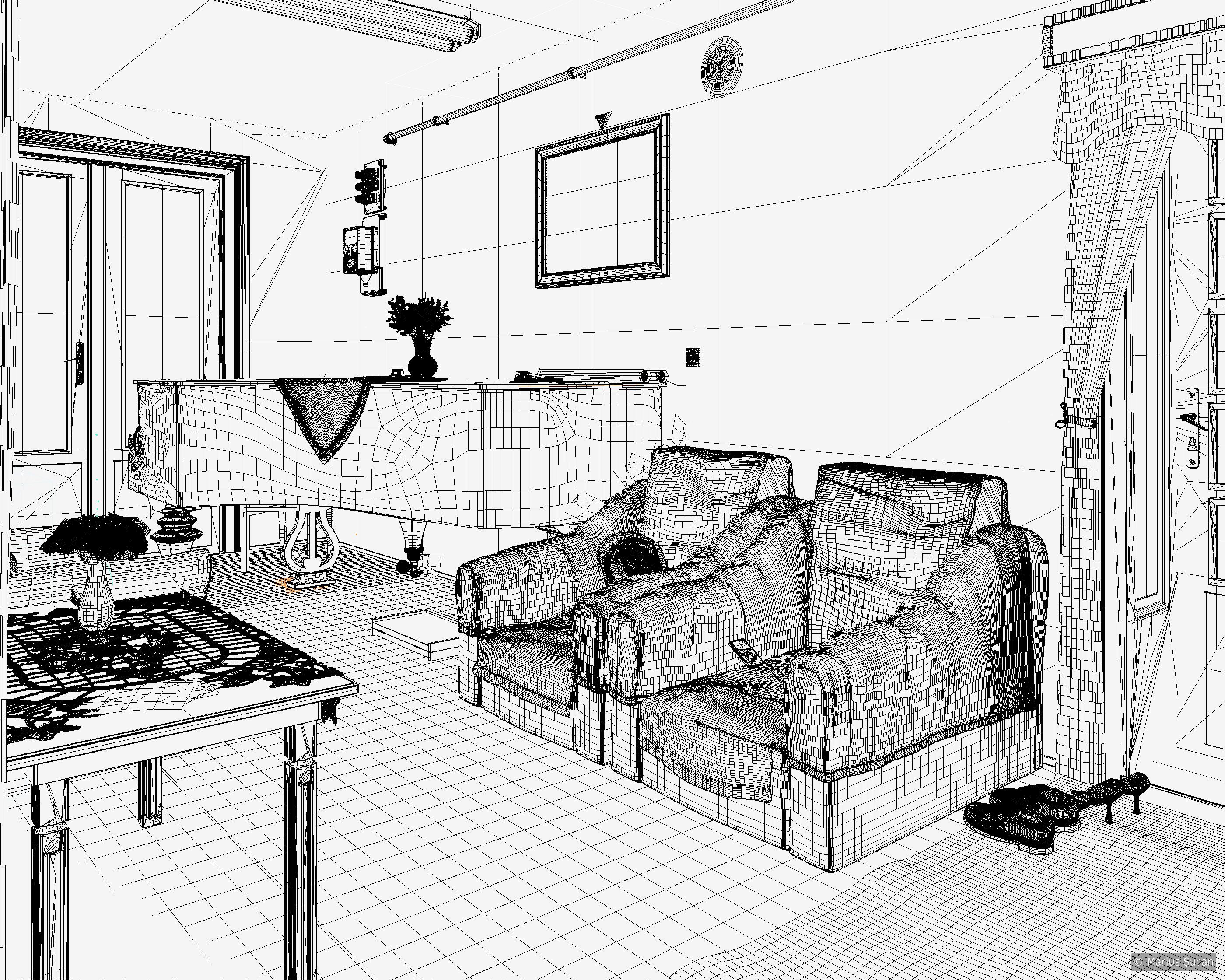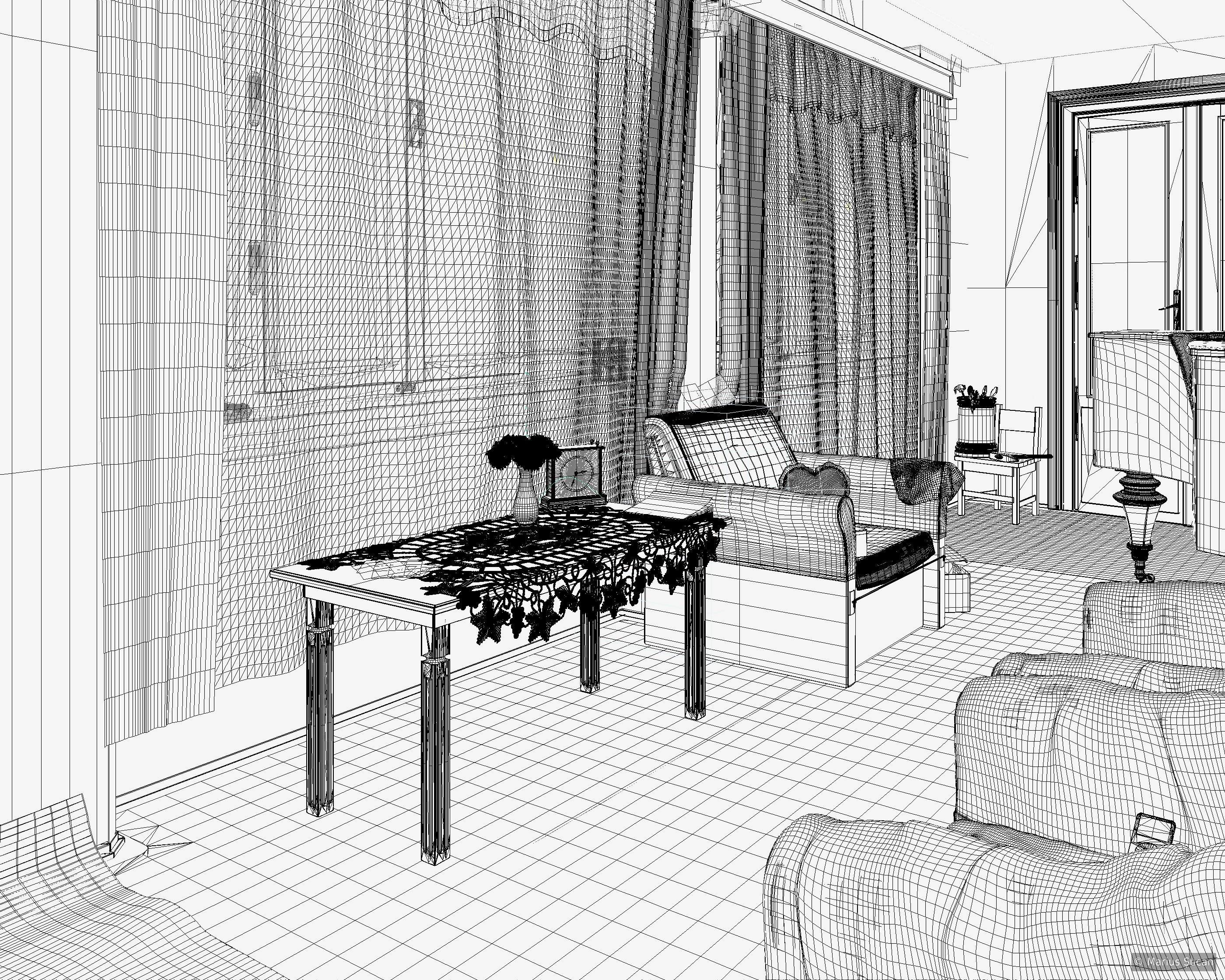 The scene, as you can already tell, is very complex and it did become a hurdle to manage. For the objects I modeled, I did my best to take into consideration the final output resolution and the perspectives from which it will be rendered. As such, the polygon count is moderate. Although, I didn't make any compromises in terms of polygon count. The highest amount of polygons is concentrated on the macramé (1,8 millions polygons) and on the flowers (840 873 polygons). In total, the scene has 4,24 millions of polygons and 2560 (9845) of objects. During render time, the application uses about 4 to 6 Gb of memory. Another fact is that I got 223 different materials in C4D and 136 texture image files totaling 1,85 Gb). The following wire-frames are more illustrative in terms of polygons density: