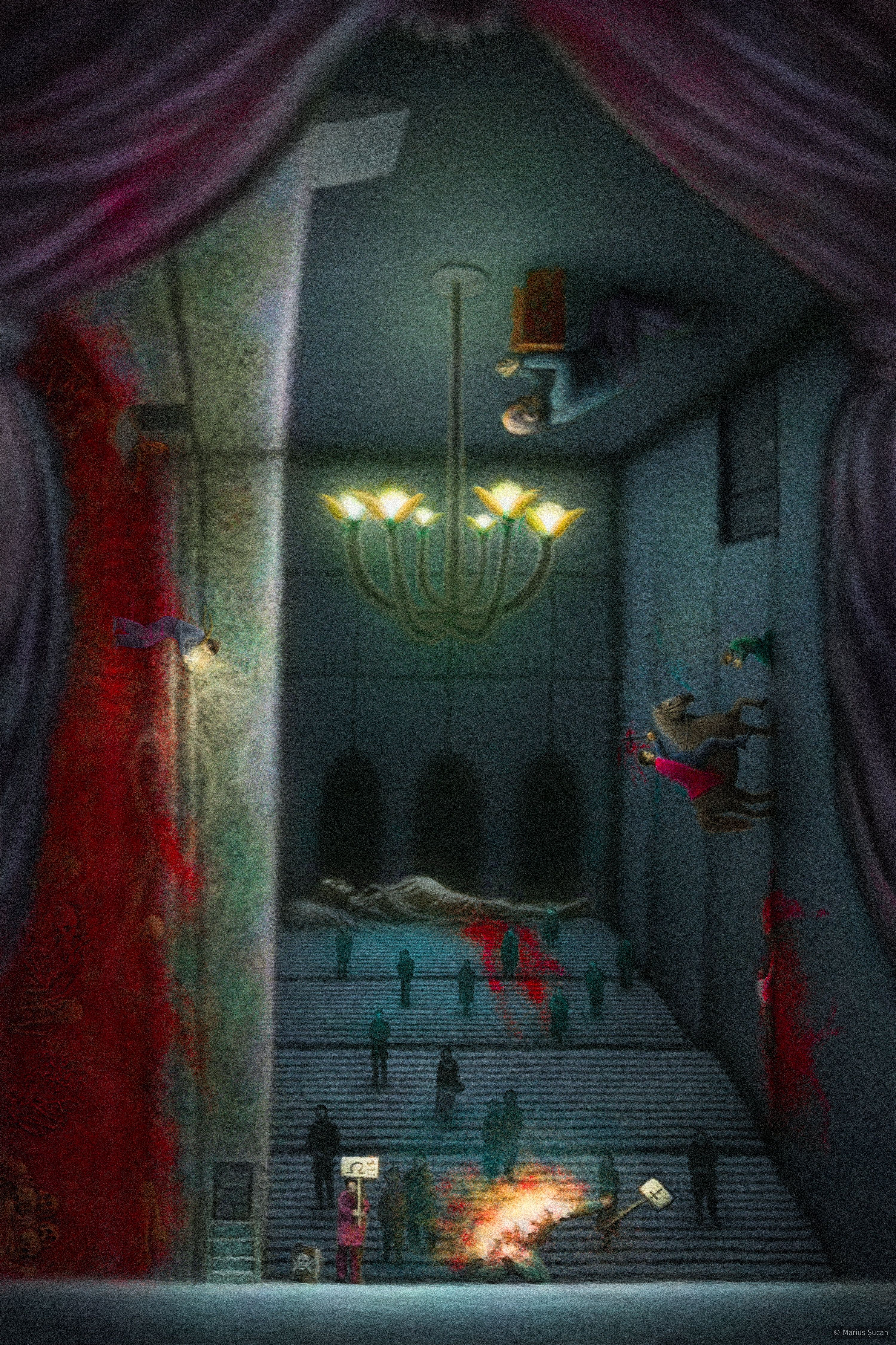 In the foreground, I painted shutter curtains and a floor that make-up a theater stage. I try to remind viewers about the philosophical concept according to which life is like a theatre, where each of us have multiple roles in a large play. On the stage there are two protesters. One holds a banner with the last letter of the Greek alphabet, Omega, in eschatology it symbolizes the end of the world. The second man has set fire to himself. There is a similar scene in the movie, as well. He was holding a banner too. On it we can see an inverted cross. This gives the viewers a clue about the subject of their dramatic protest: it could be against Christianity, or a protest aimed to warn people that humanity is heading in the wrong direction, that we become too secular. We can also see in the background of the protesters, three rows of large steps populated with people. They are witnessing the tragic event like passive spectators in a theatre, they are detached and do not care about what is happening. The scene is also found at the end of the movie. On the same steps, people attended the speech of a madman, about existential matters and faith. In the end, he sets himself on fire and no one seems to care.
