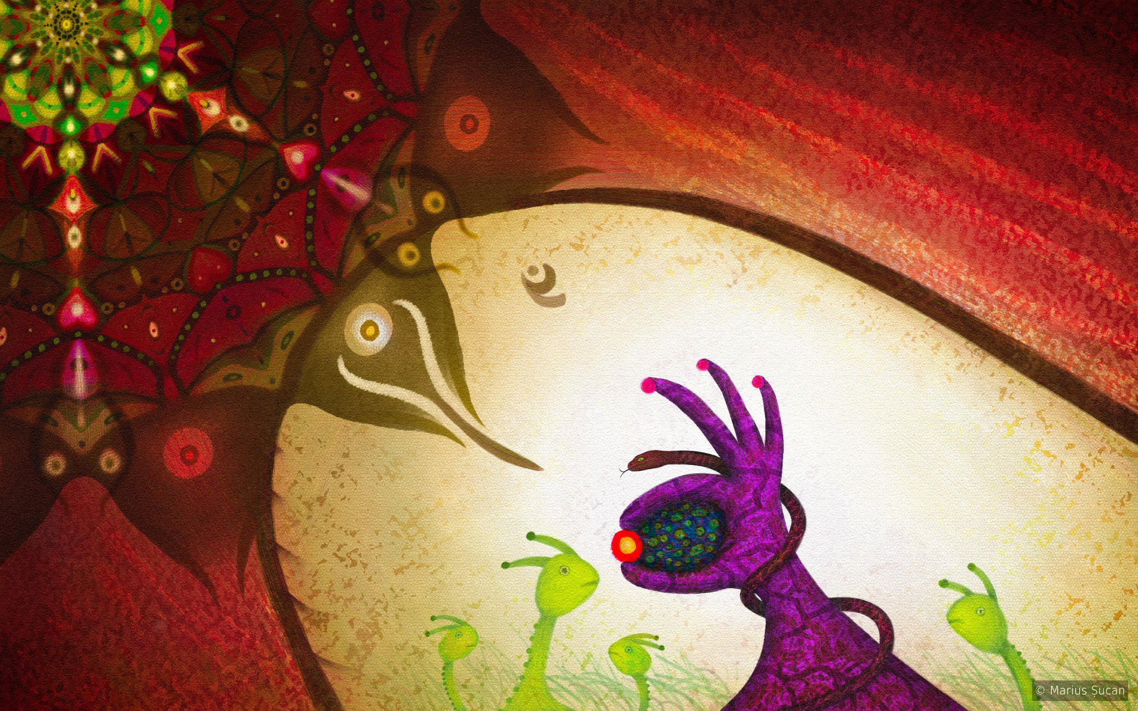 The key to understand the image is to first see the encompassing white creature, how it interacts with the external entity (the kaleidoscope), using its tongue. The creature is about to get a pill and it already has a tongue inside. If you look carefully, you may see that the snake is also attempting to connect with the outer entity, with its tongue. I also try to suggest that the snake somehow exerts its power over the hand that feeds the small green creatures. Notice that one green creature is discriminated, left outside, because somehow it is no longer privileged to get food.