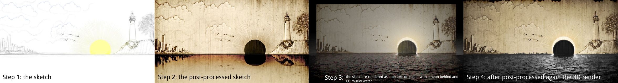 and even Vray. Afterwards, I used the post-processed sketch as a texture map on a plane in a new 3D virtual scene.