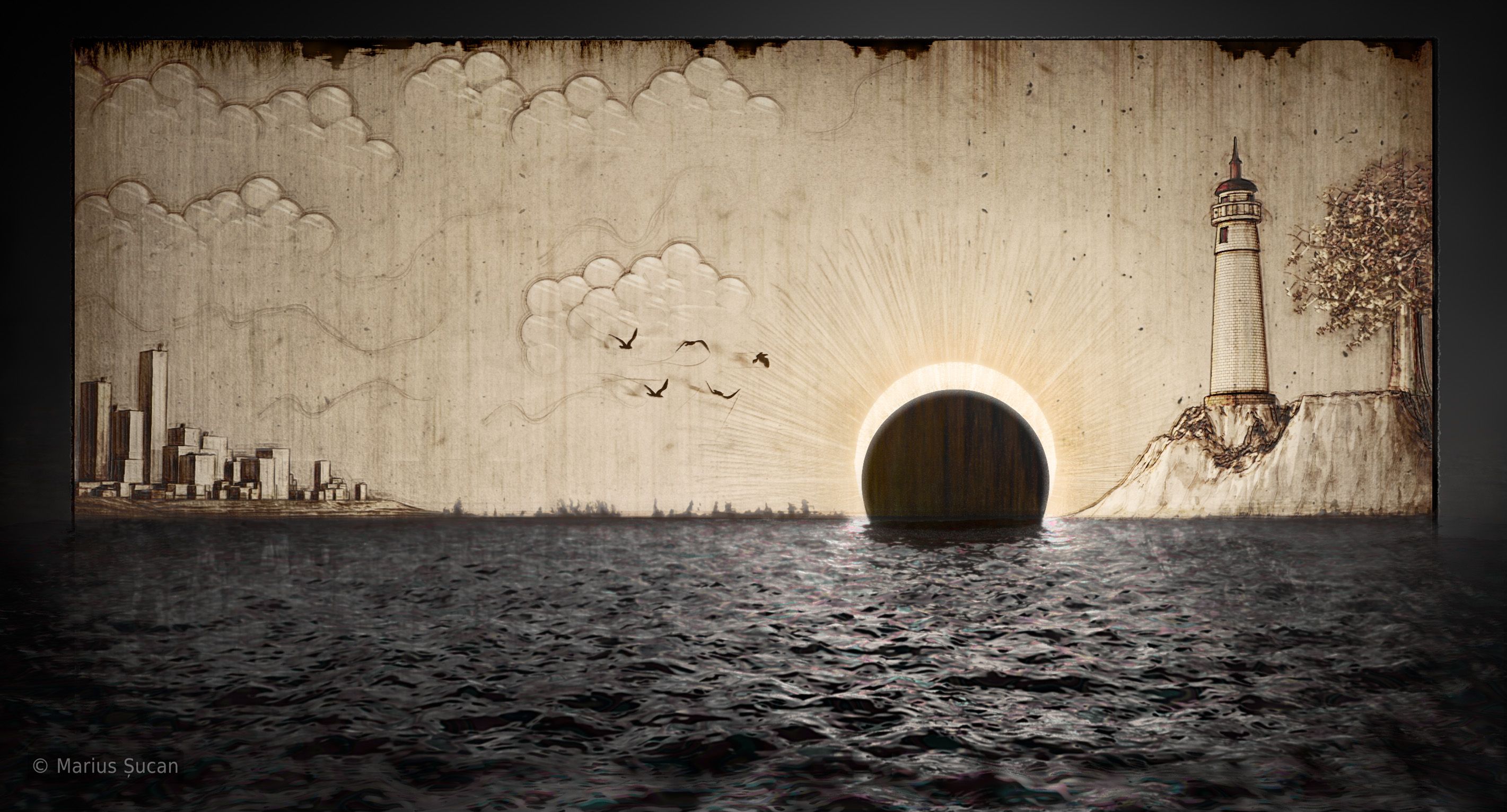 The theme of this image is related to ecology. The dark water is intended to remind the viewers of oil. The solar eclipse at sunset is meant to suggest the end of time, the end of humanity, that we inflict ourselves through ecologic disasters. The solar eclipse is like a catalyst, it dramatizes the sunset. And, because of how I illustrated this very rare solar event, the element might remind to some viewers how the atomic bomb looks like. On the left side of the composition, we see clouds are gathering and, in the center, birds are flying away. These further support the central message of the image.