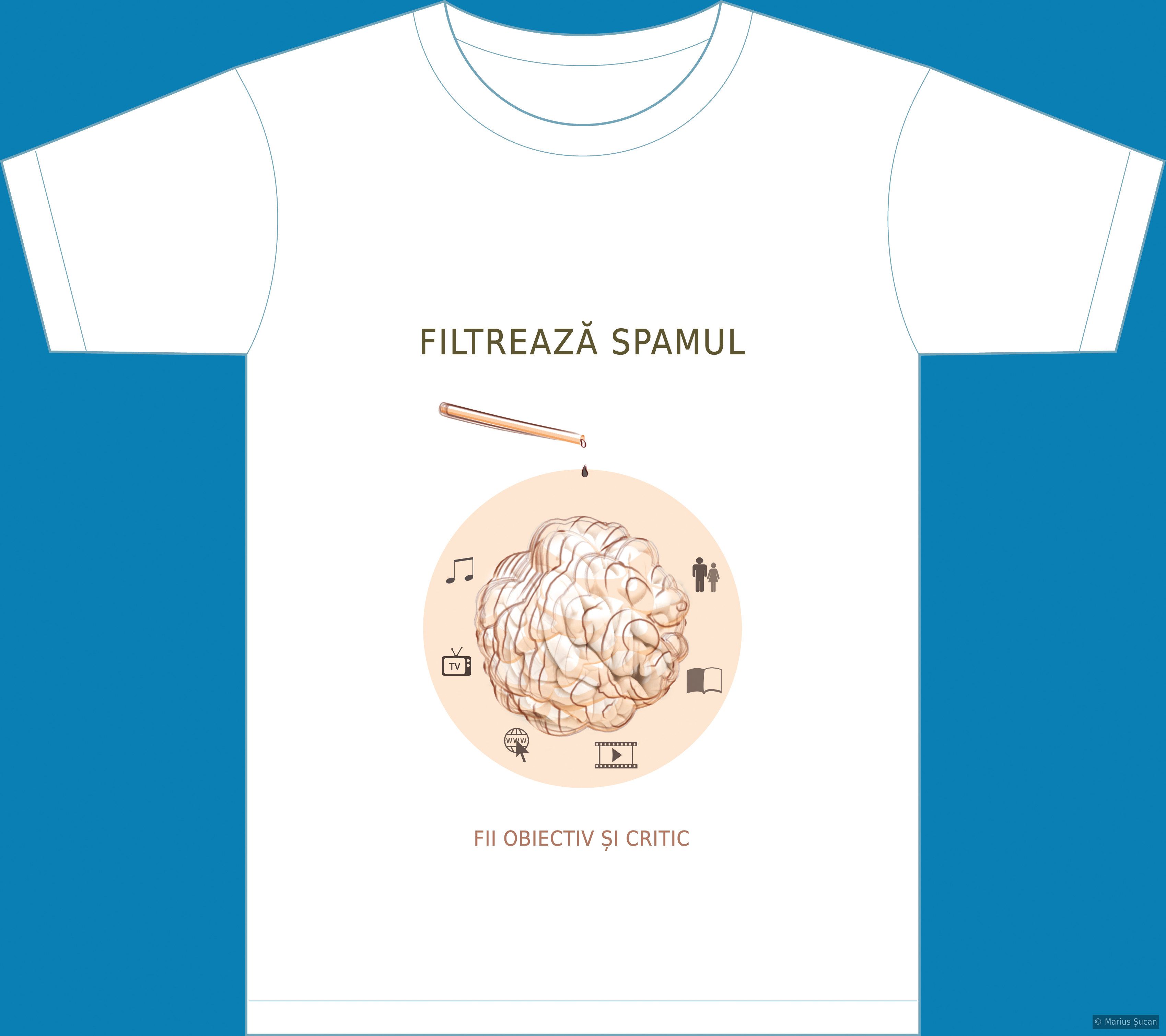 This t-shirt design contains texts written in Romanian. The title says: "Filter the spam". In the lower section of image, the text reads: "Be objective and critical".
