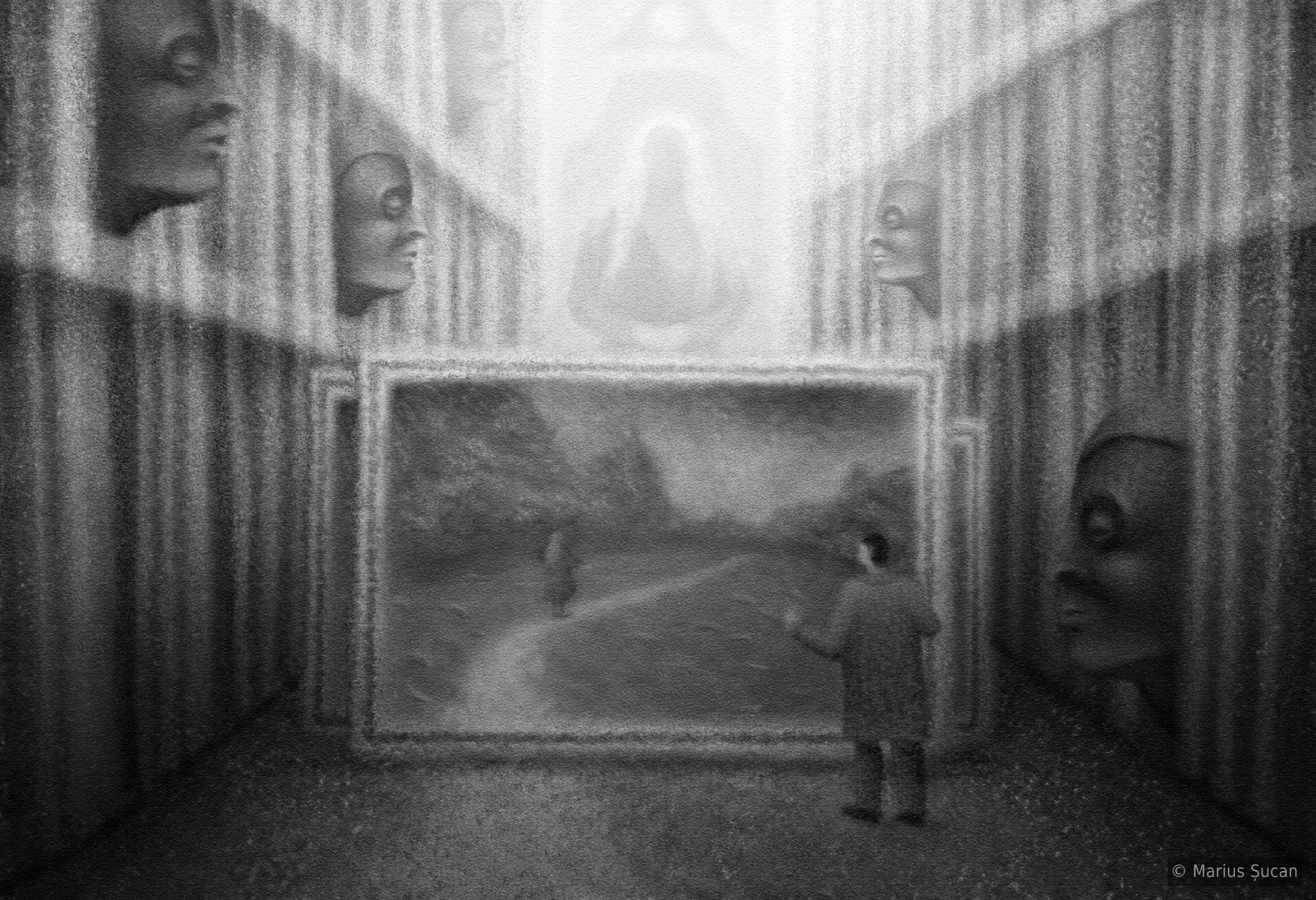 Above the central painting, I depicted a ghost-like Madonna, half-transparent, against a really bright light at the end of the hallway. The Madonna has a bright halo and she is framed mainly by the walls of the hallway and also with a subtle play of light. The way it looks like, might remind of iconography. By how she is positioned in the composition, above and behind the paintings of the past, I suggest she is an ubiquitous presence in his life, she has the role of a guardian angel, a protector. This element in the image, is a religious one. So, I point out the presence of the divine and its influence on his life.