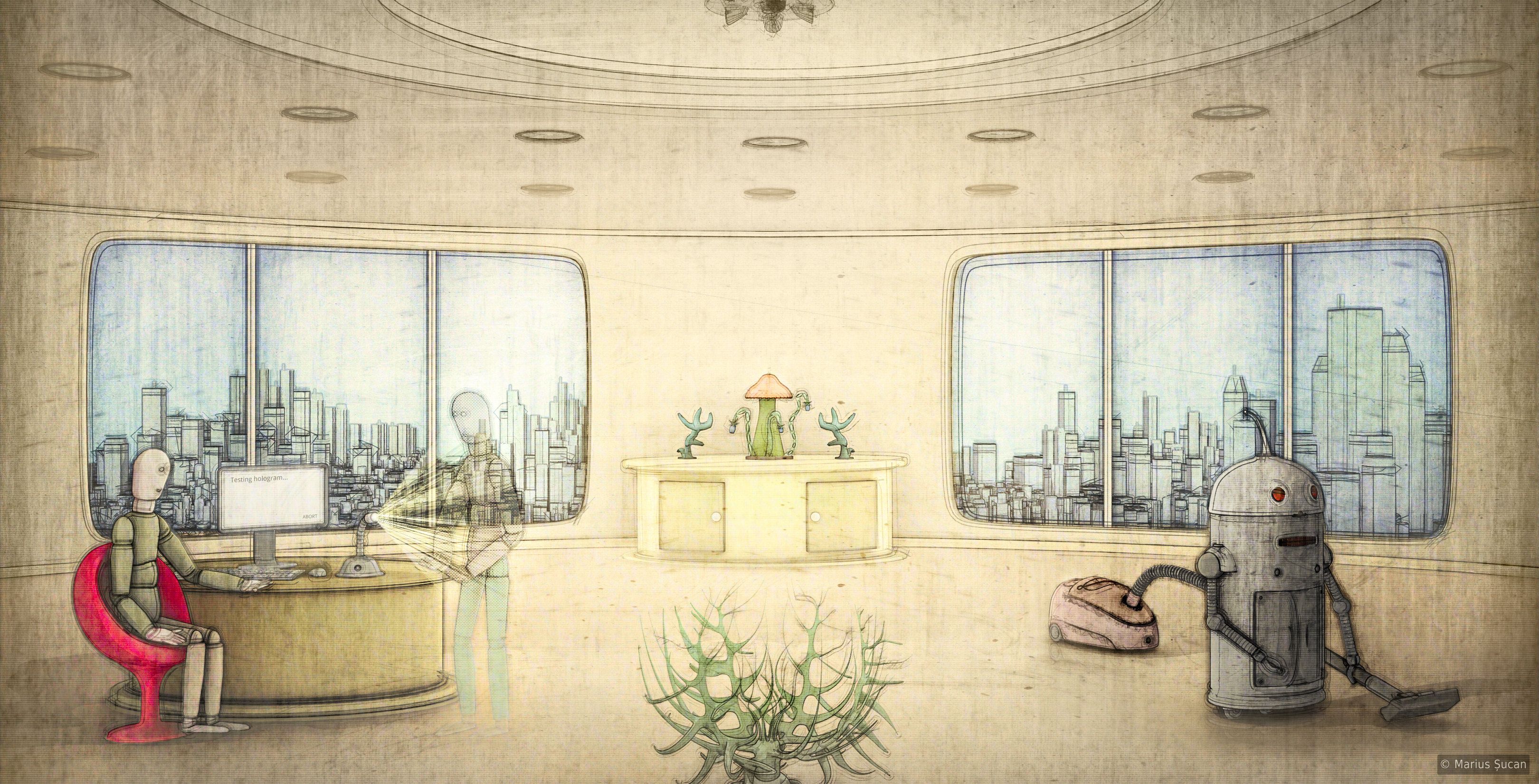 The subject of the image is set in the future. The future is suggested by multiple elements in the composition: skyscrapers and the robot. The room has an oval shape. The perspective I chose highlights its symmetry. At compositional level, one can see a similarity with glasses. The main lines of the oval room and how the windows are arranged in the composition, might remind to some viewers of glass lenses. This creates ambiguity about how the image can be interpreted. Is this an illustration of a simple building set in the future or is it something as seen from behind the eyes of a robot ?