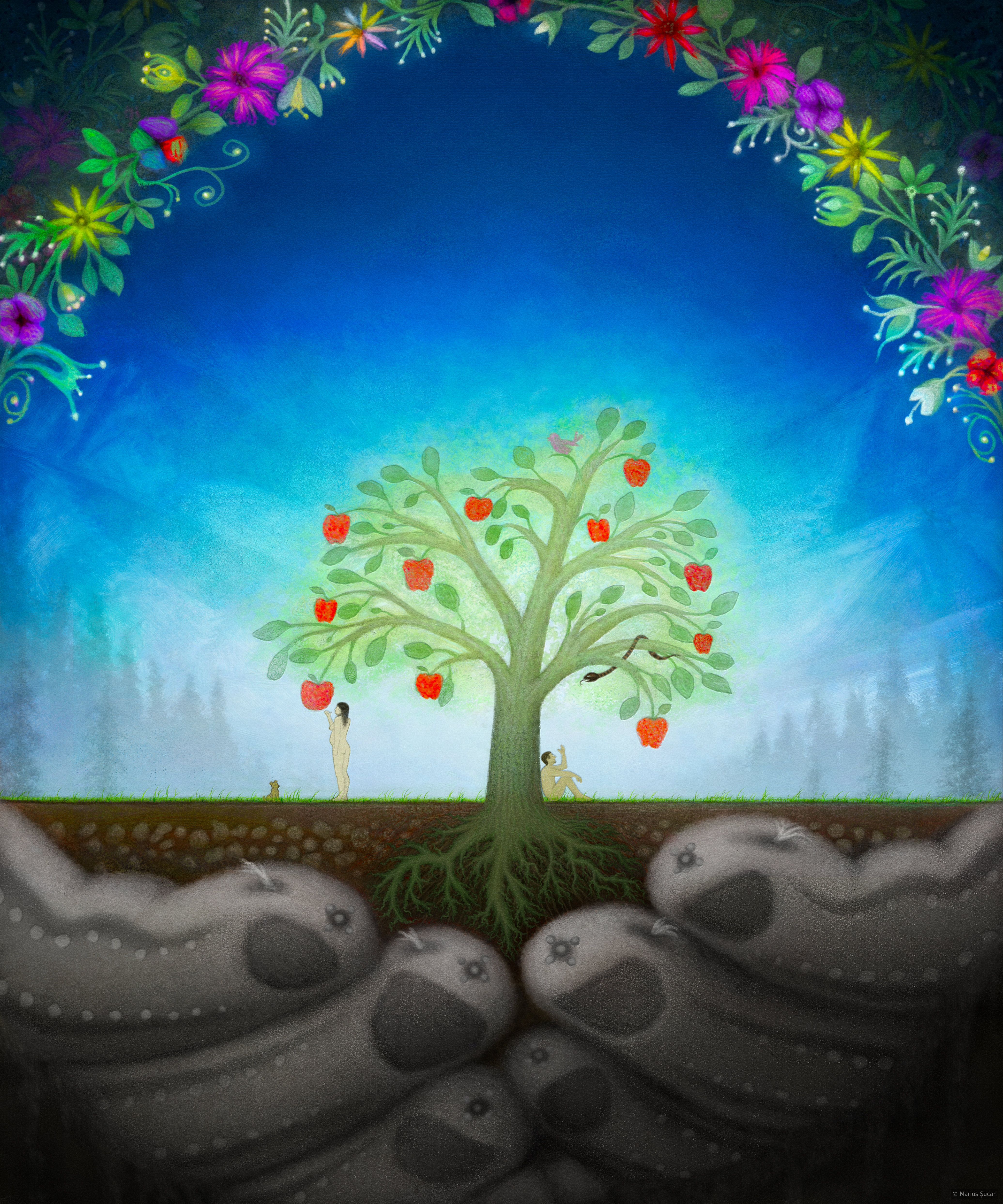 In the underground, below the roots of the tree, two big hands support the entire scene, the world, in a protective way. These are decorated with elements reminiscent of floral decorations. In this way I make a subtle connection between the arch of flowers and God. Moreover, one can speak about a world behind and beyond appearances, beyond what the the ordinary man gets to know. The hands represent a force that Adam and Eve know a little about. They are at the hand of God. Many Christian believers say that we are at God's mercy.